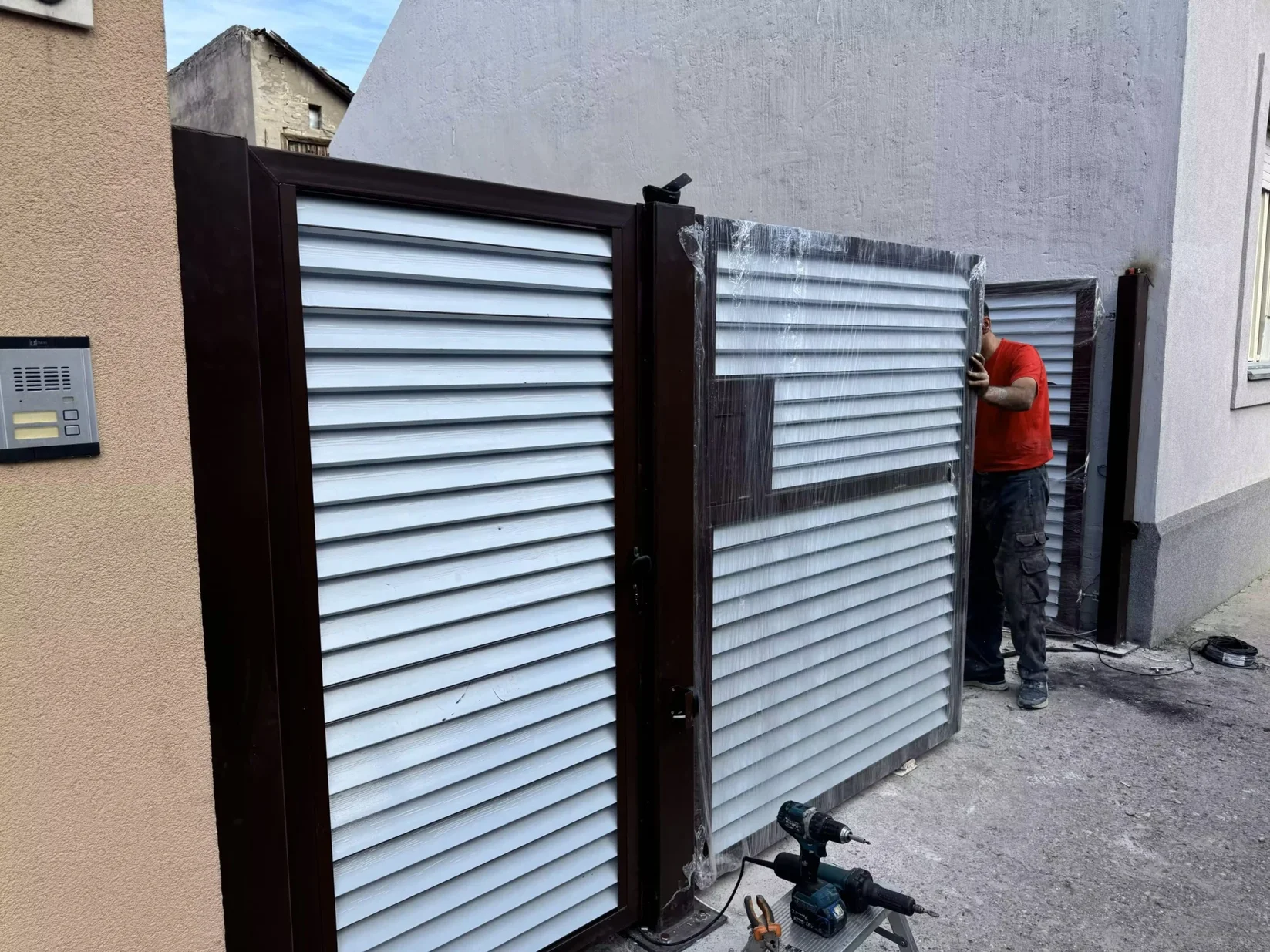 Za klijenta u Novom Sadu postavljena je dvokrilna aluminijumska kapija TIVOLI u braon boji RAL8017, savršeno prilagođena za obezbeđivanje privatnosti i sigurnosti dvorišta. Ova kapija je izrađena od aluminijumskih profila dimenzija 80×20 mm, postavljenih ukoso, čime se postiže potpuno neprozirni efekat koji štiti privatnost prostora iza kapije.