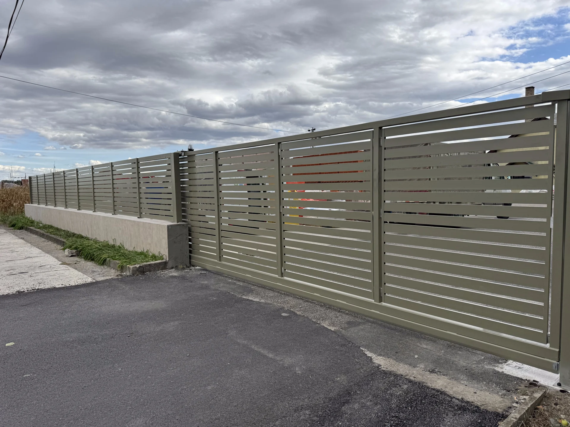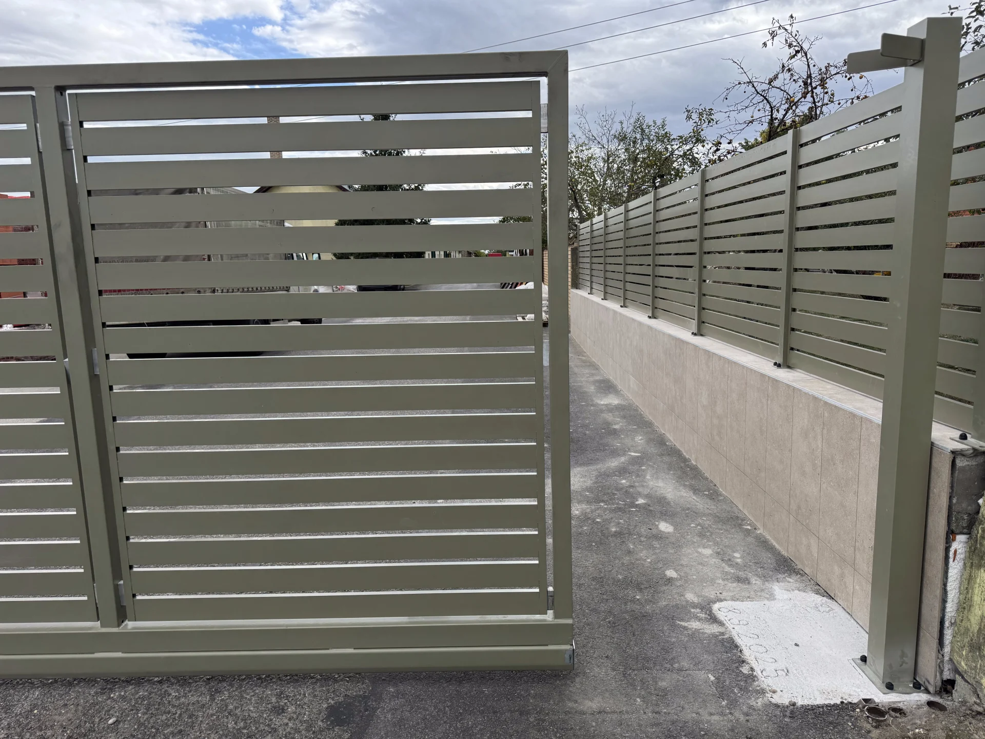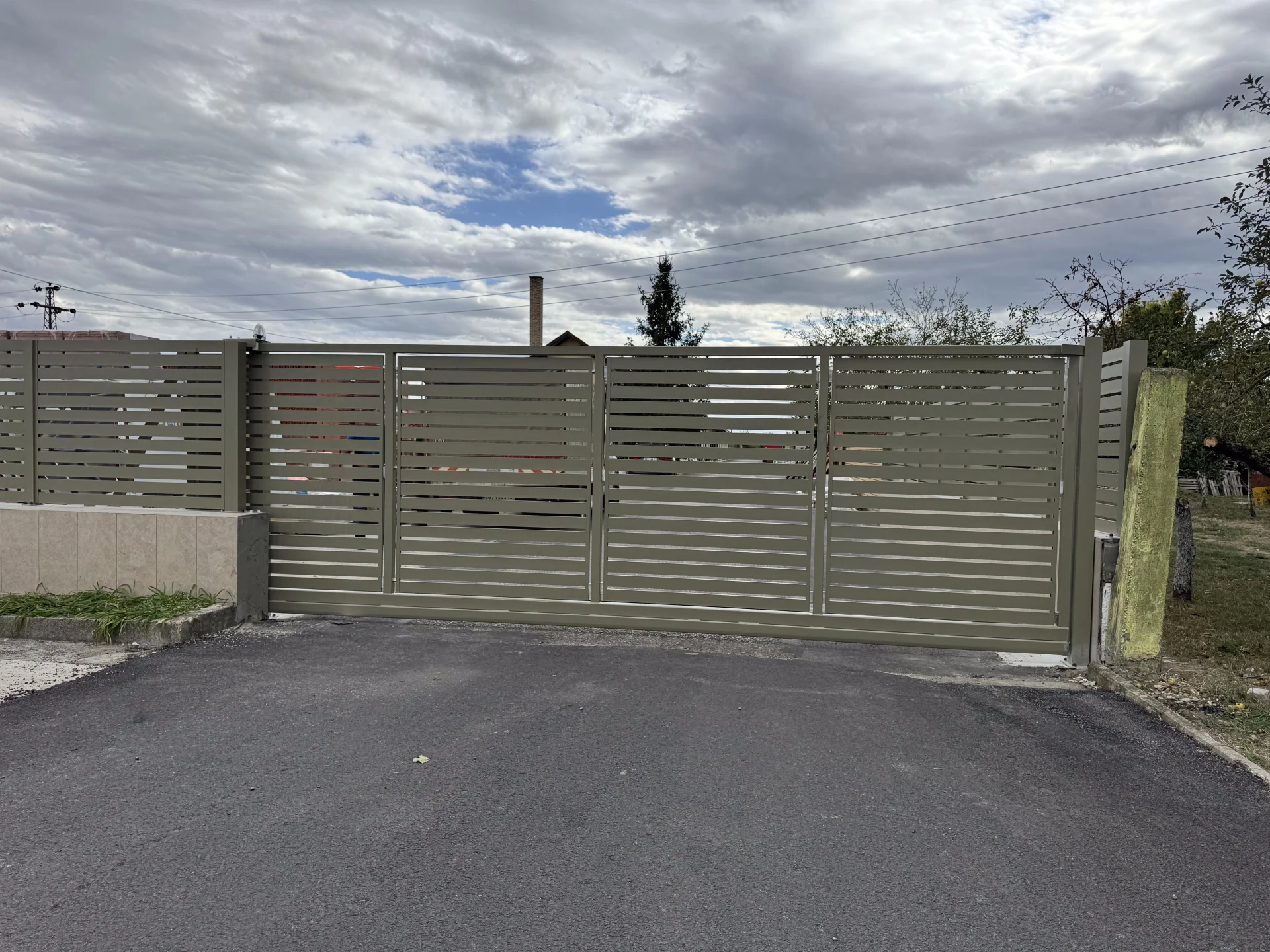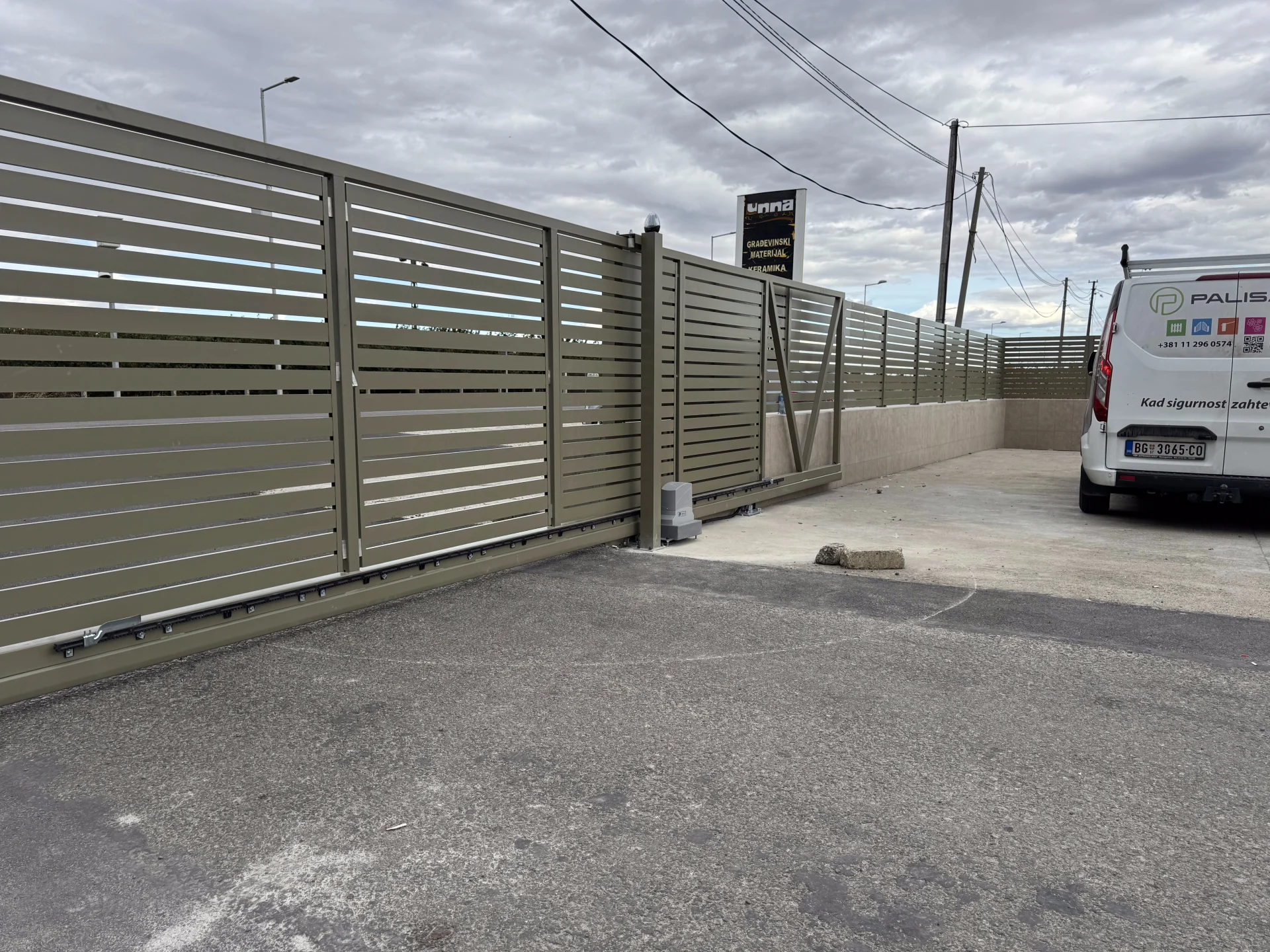 Dizajn i materijali: Kapija je izrađena od aluminijumskih profila vrhunskog kvaliteta, u istoj boji RAL7002, kako bi se postigla potpuna vizuelna usklađenost sa ogradom.