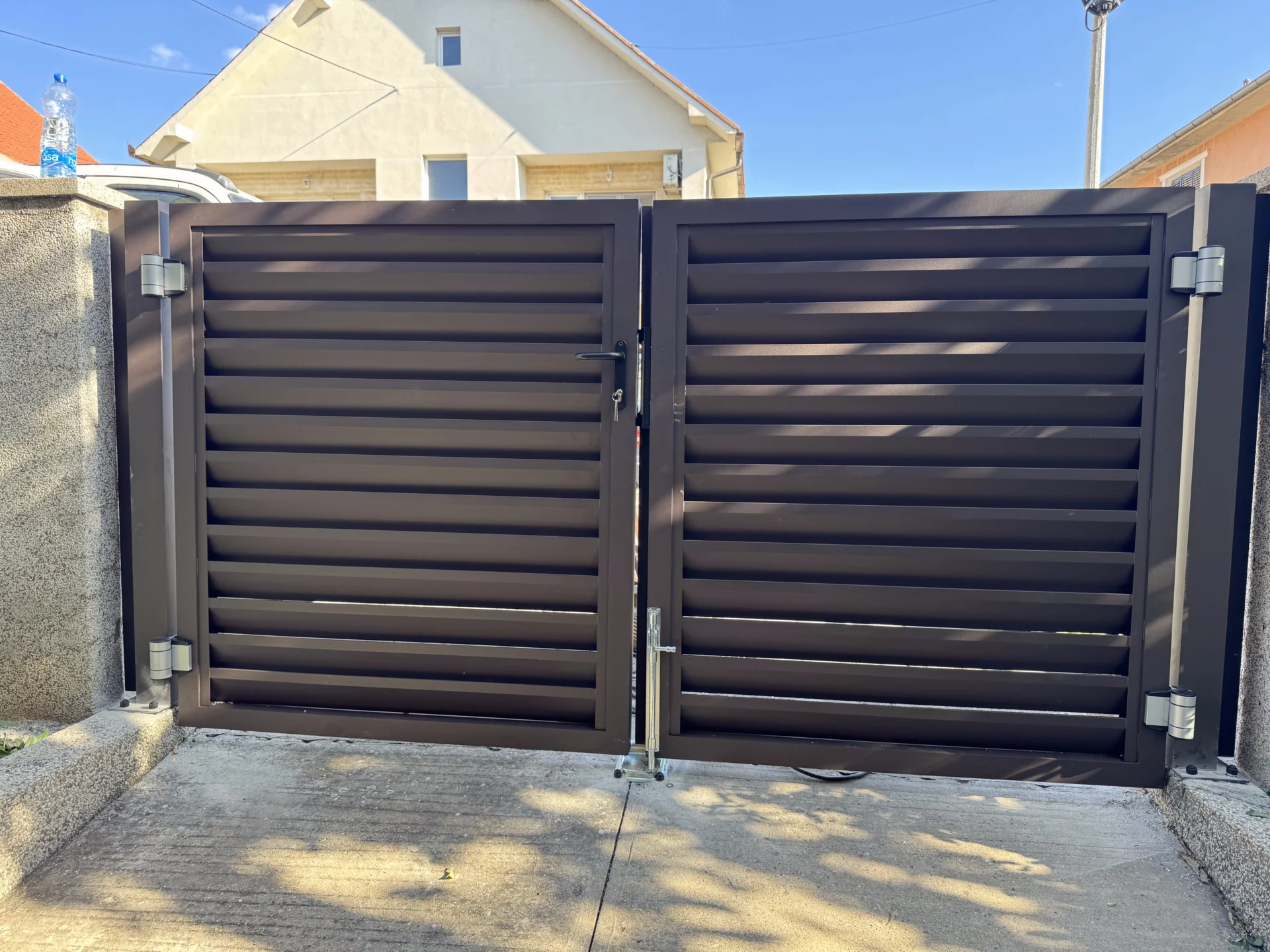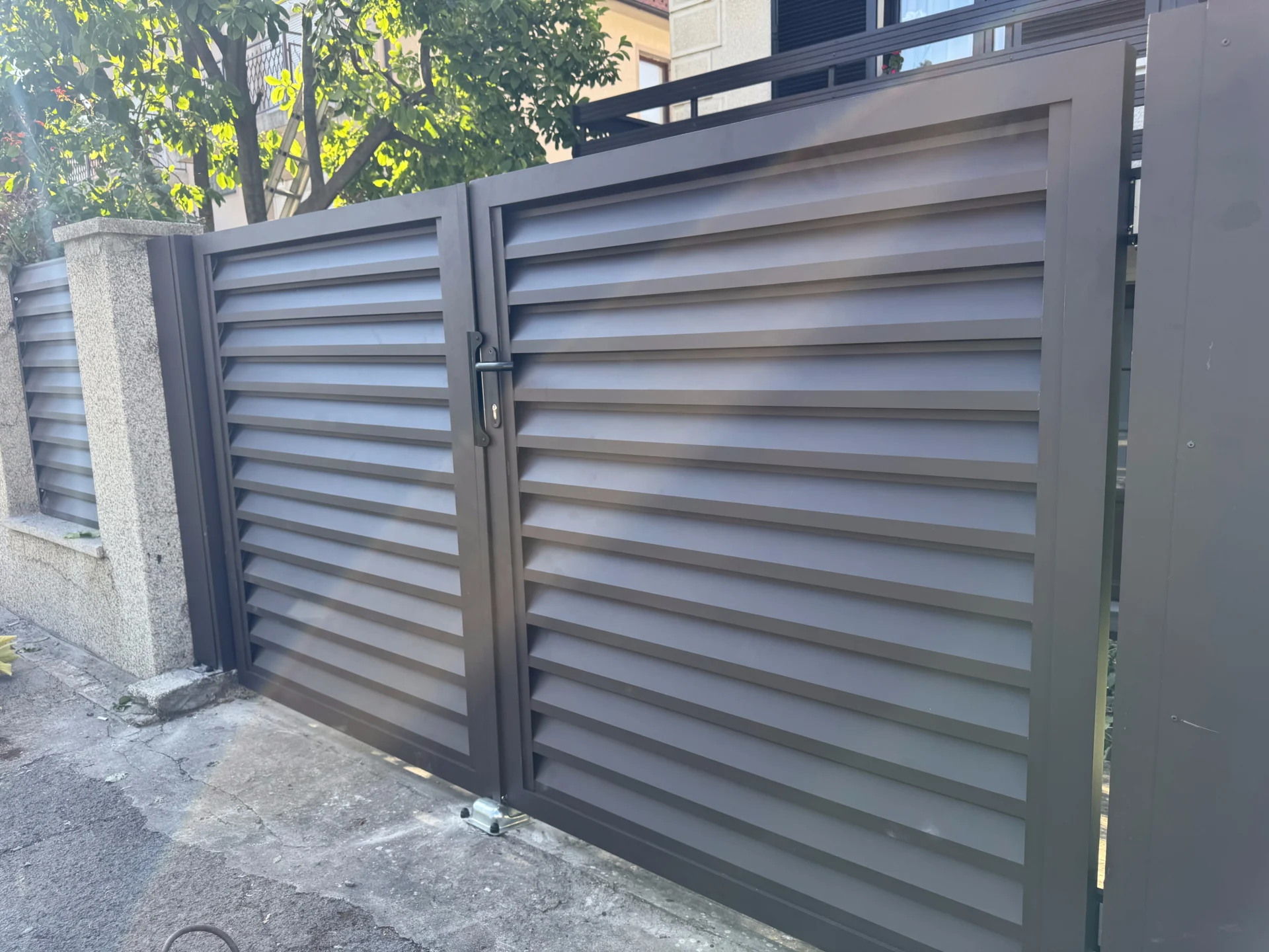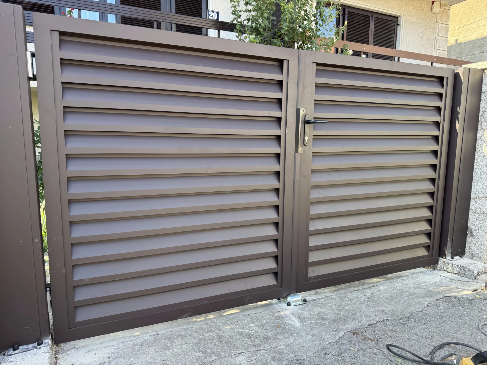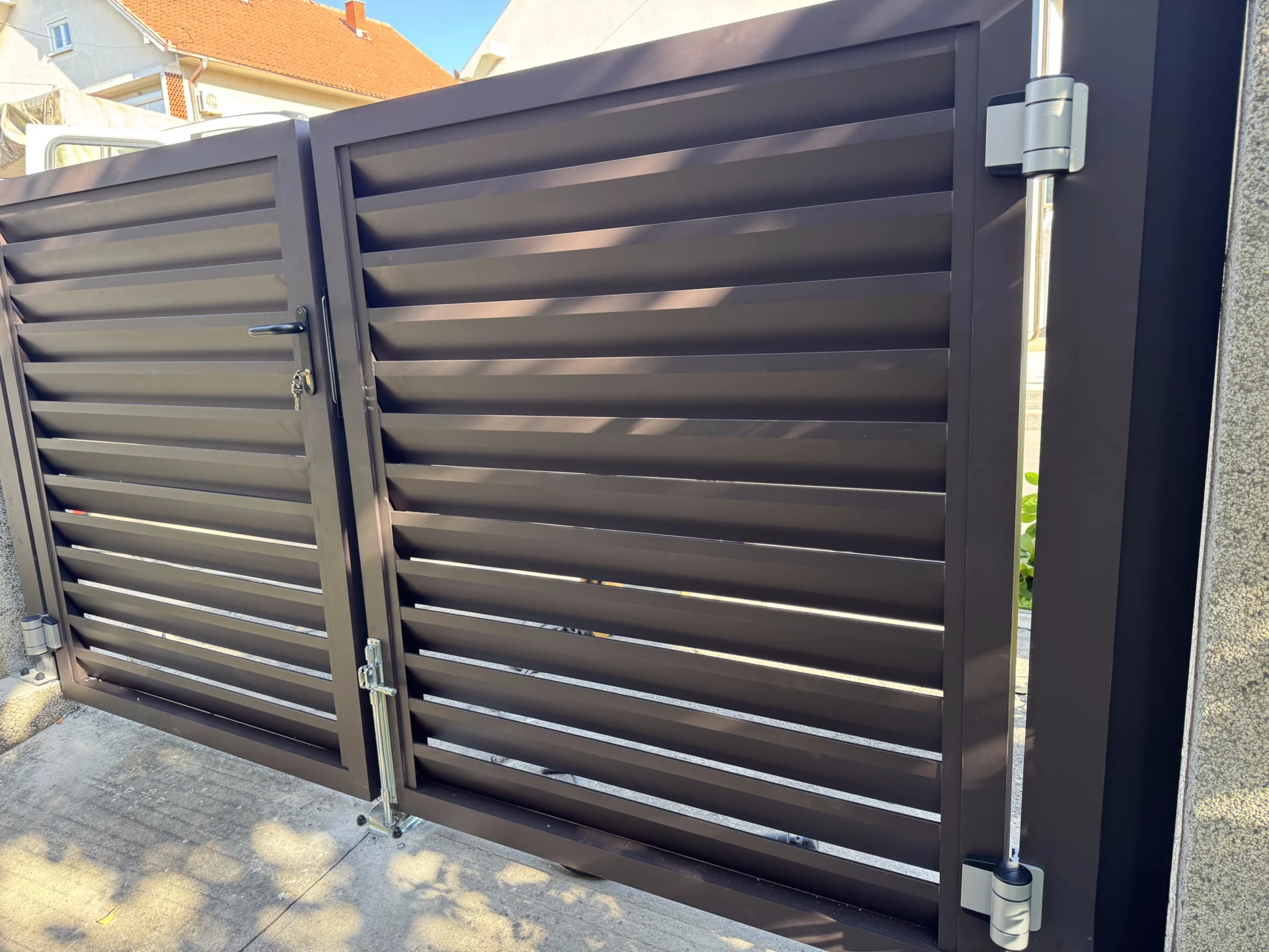 Instalirana je i pešačka aluminijumska kapija TIVOLI, izrađena u istom stilu i boji, sa okovom LOCINOX koji obezbeđuje dug vek trajanja i besprekornu funkcionalnost.