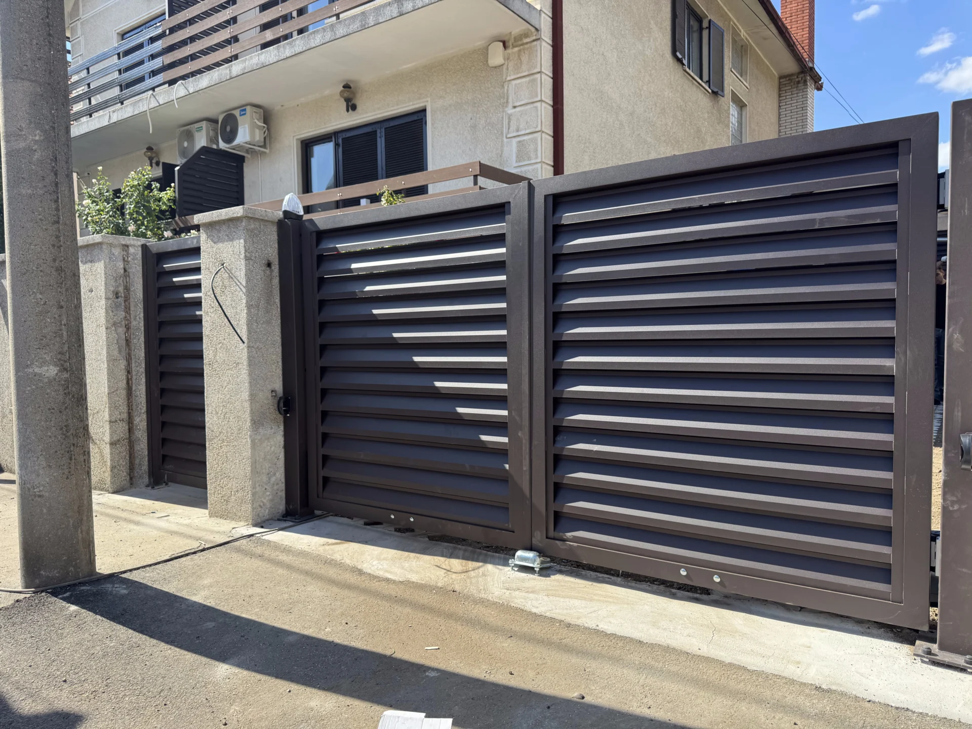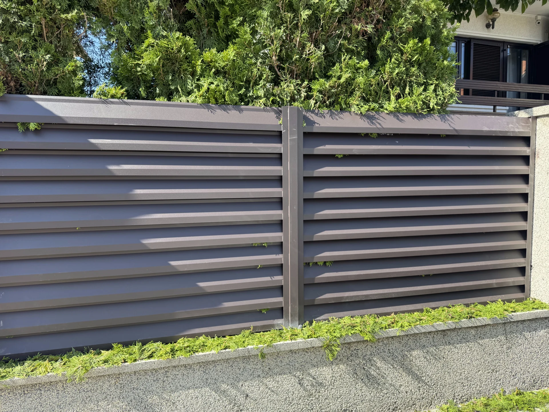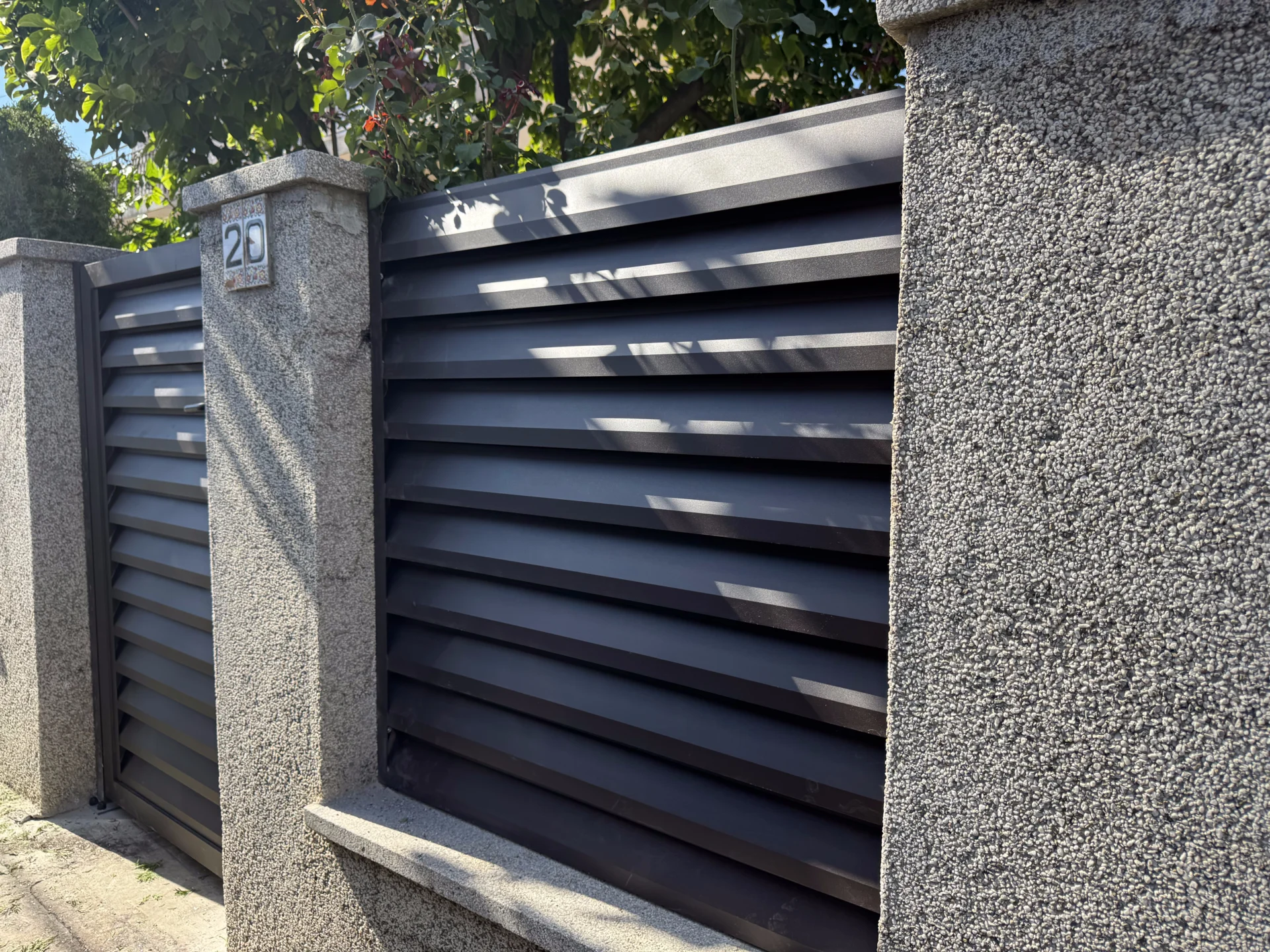 Dvokrilna kapija: Na ulazu u dvorište postavljena je dvokrilna aluminijumska kapija TIVOLI, izrađena u istom stilu i boji kao i ograda – RAL7016 antracit siva, čime je postignuta potpuna vizuelna i estetska usklađenost.