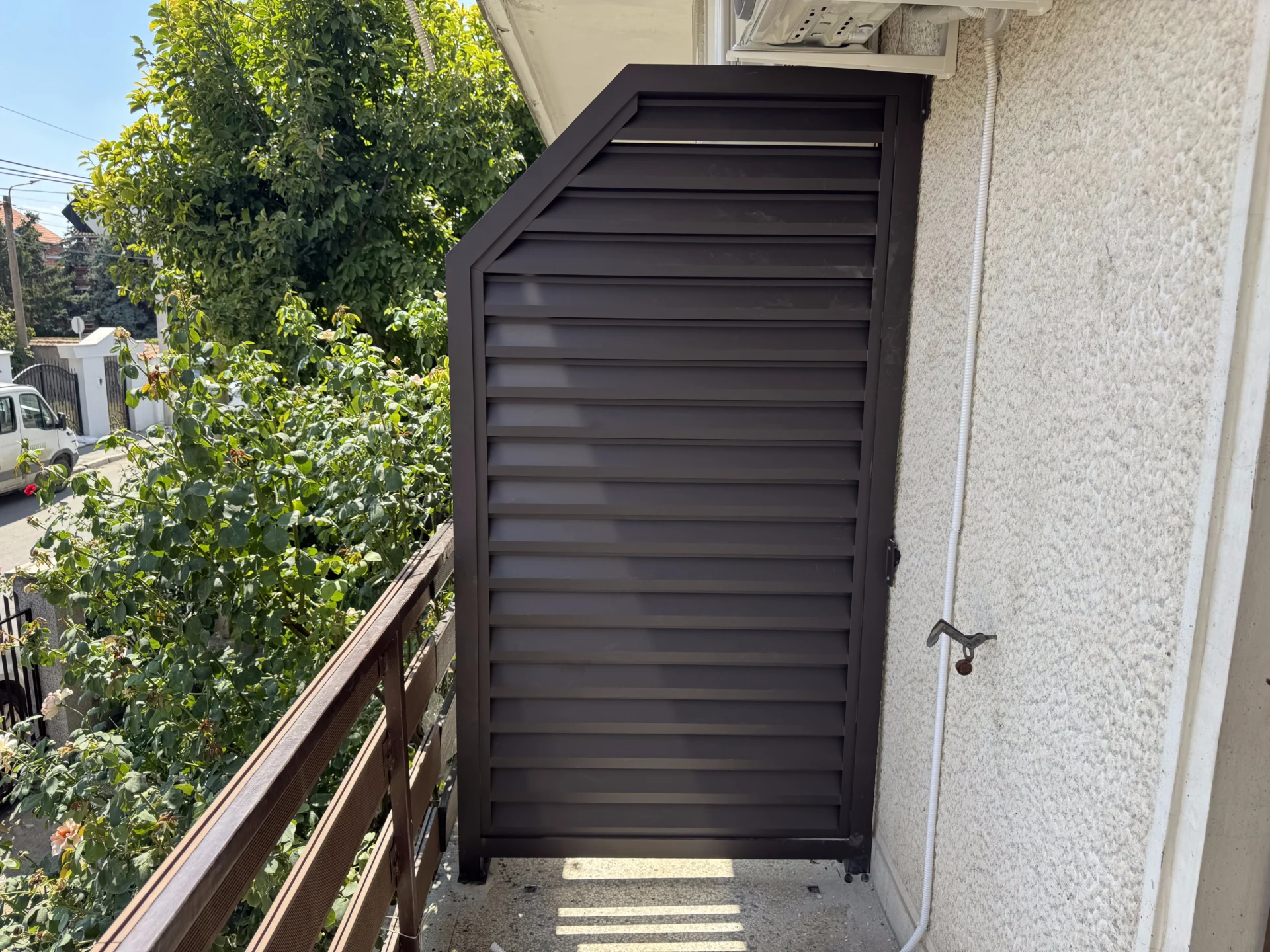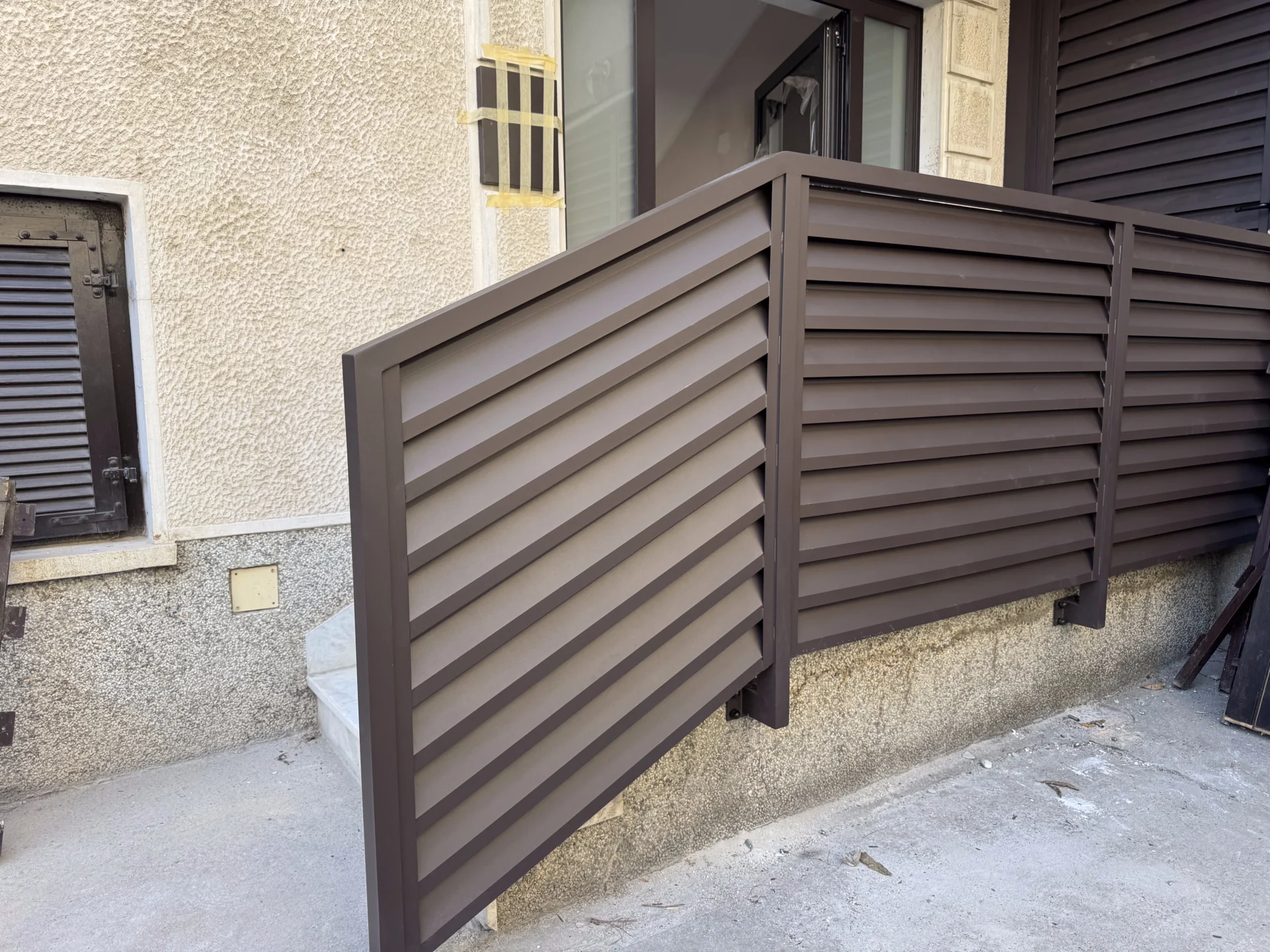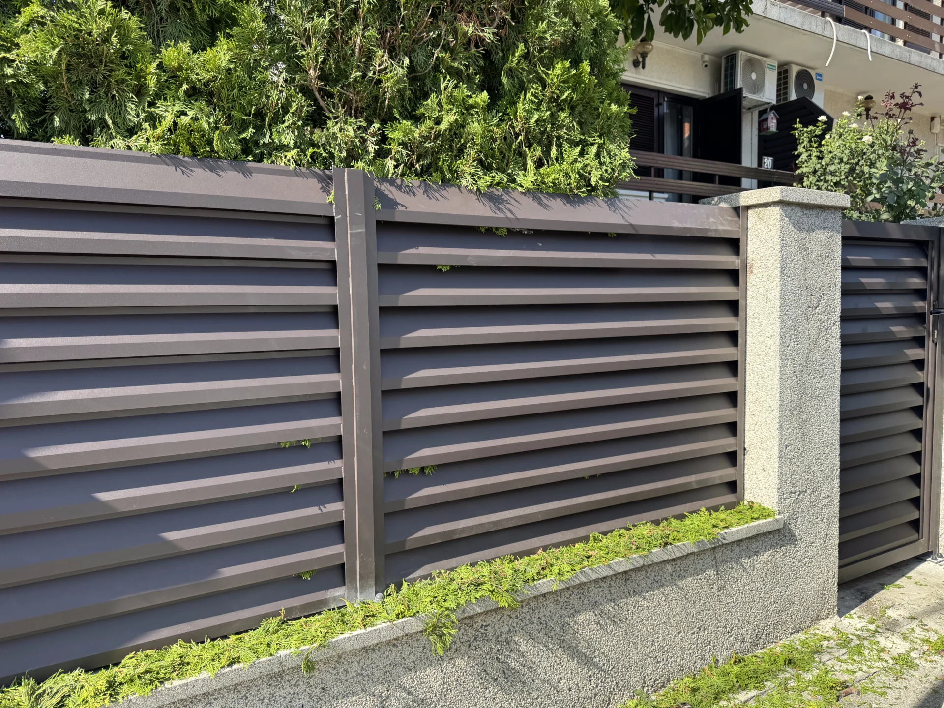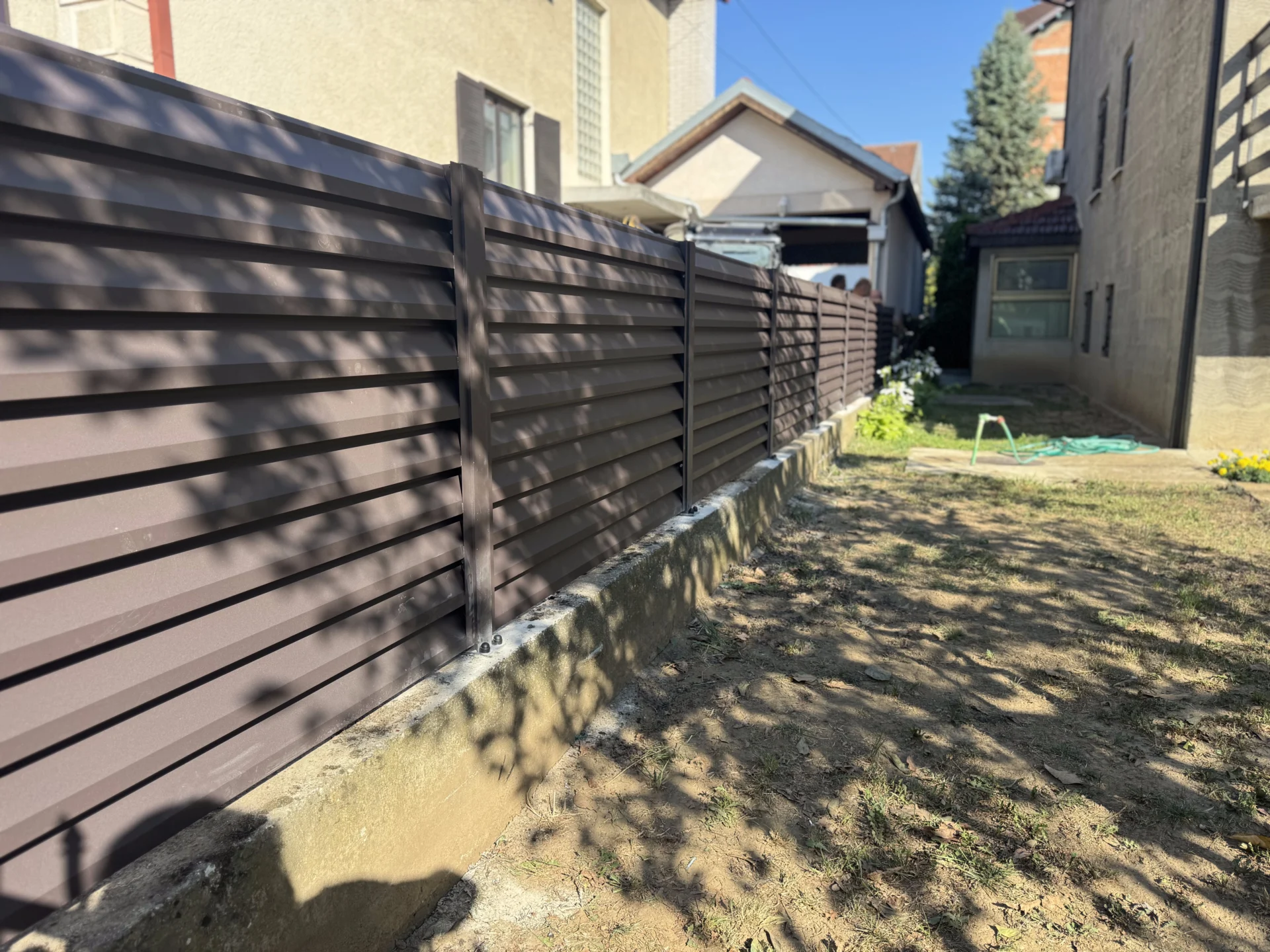 Izrada i montaža: Na ovom objektu izvedena je dvorišna aluminijumska ograda TIVOLI, postavljena na betonski parapet. Ogradni paneli su izrađeni od aluminijumskih Z profila, poznatih po svojoj izdržljivosti i otpornosti na koroziju, dok su stubovi od aluminijuma sa anker stopom učvršćeni u betonsku podlogu.