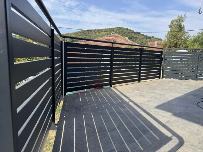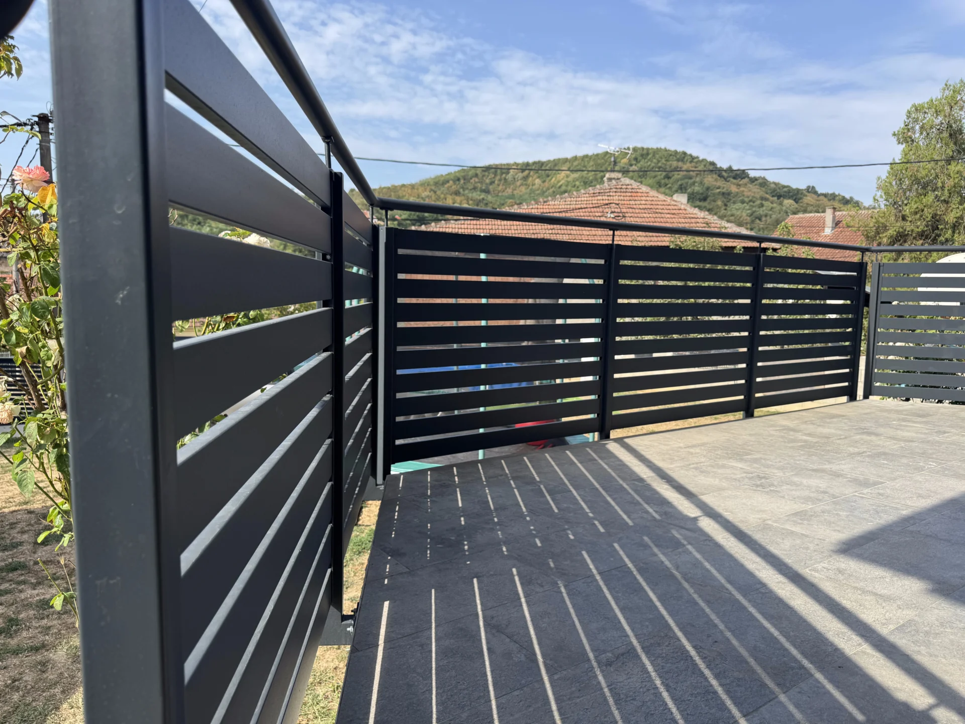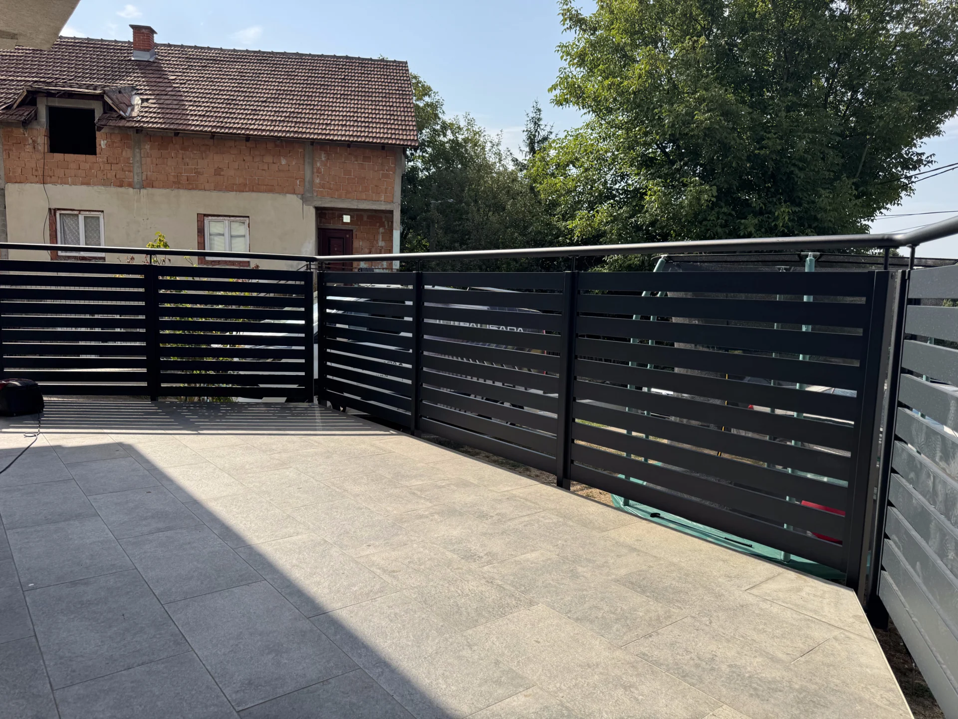 Dimenzije i konstrukcija: Ograda je izvedena u visini od 1,1 m, u skladu sa standardima za zaštitne ograde na terasama. Izrađena je od aluminijumskih profila dimenzija 80×20 mm, sa pažljivo odmerenim rastojanjem između lamela, što doprinosi delimično transparentnom i elegantnom izgledu.