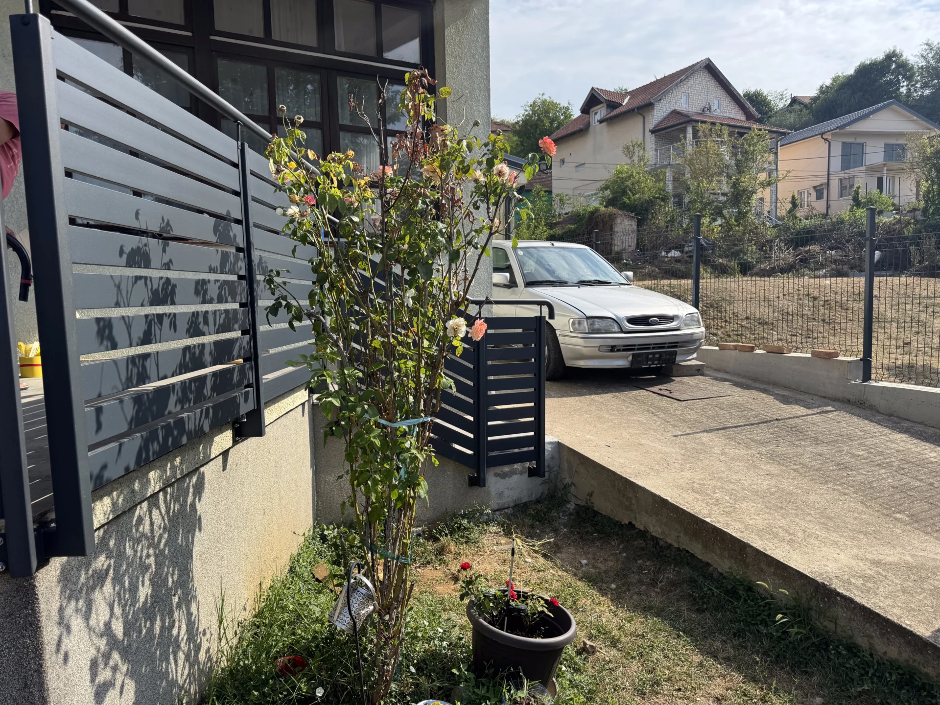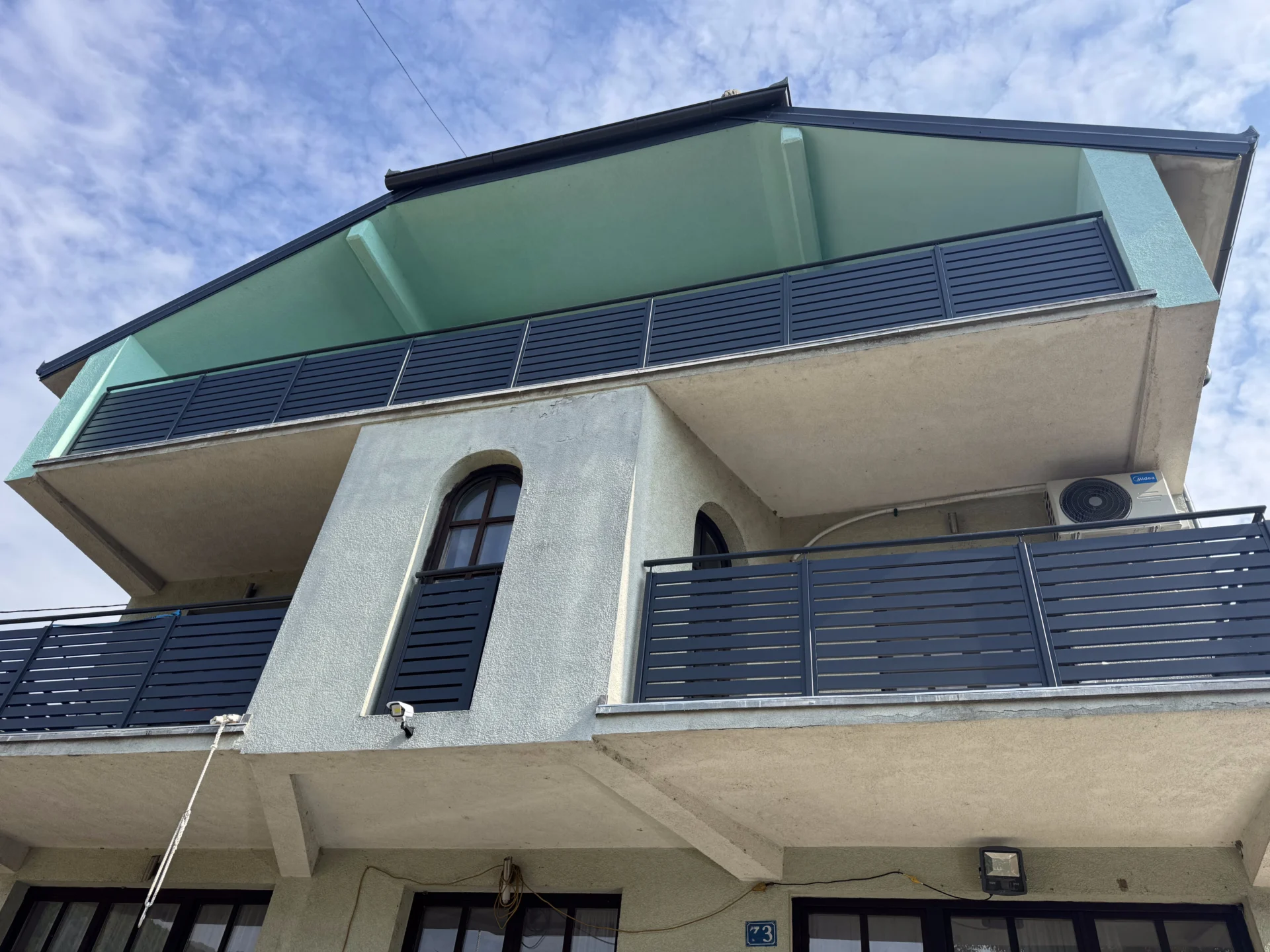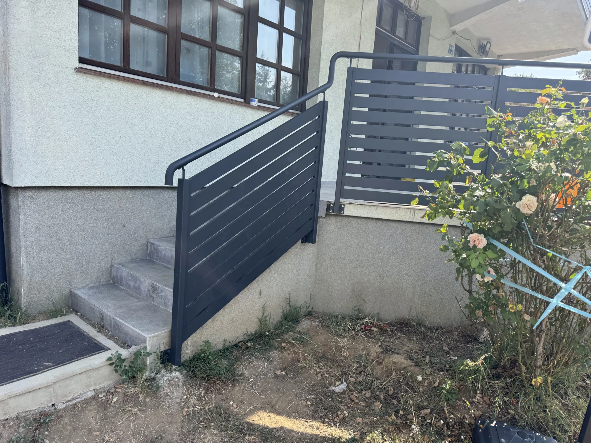 Dimenzije i konstrukcija: Ograda je izvedena u visini od 1,1 m, u skladu sa standardima za zaštitne ograde na terasama. Izrađena je od aluminijumskih profila dimenzija 80×20 mm, sa pažljivo odmerenim rastojanjem između lamela, što doprinosi delimično transparentnom i elegantnom izgledu.