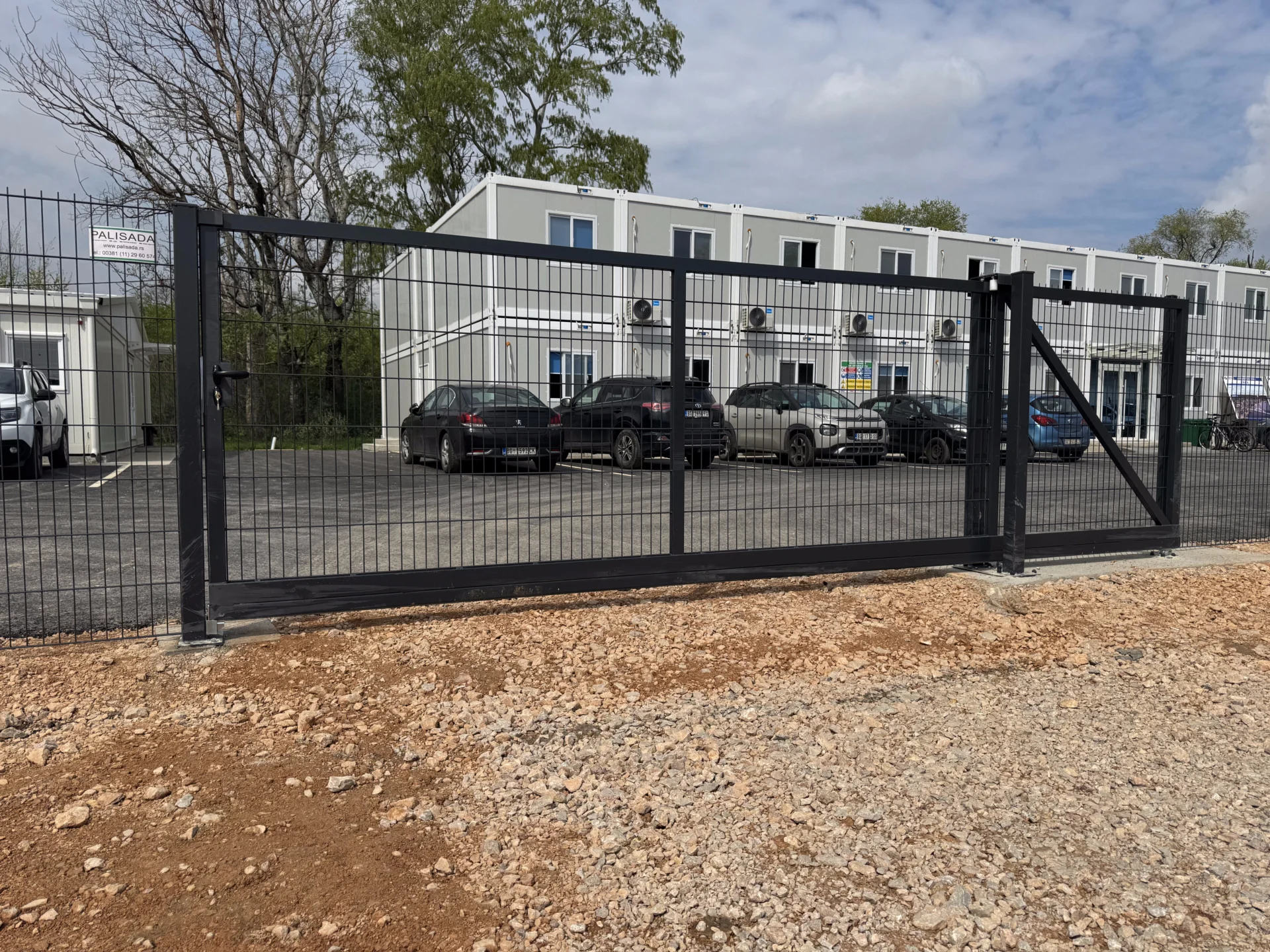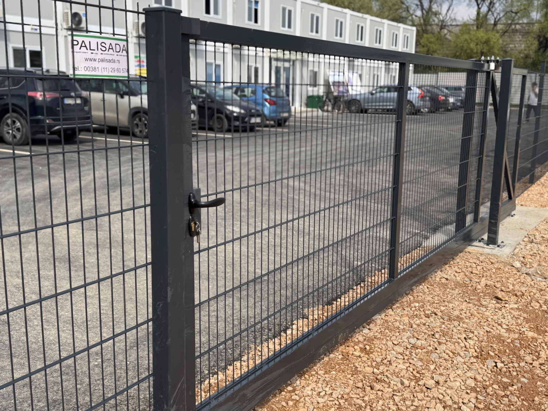 Pored ograde, ugrađena je i samonosiva kapija LIGHT, izrađena od čeličnih toplocinkovanih profila, sa ispunom od panela. Kapija je dodatno plastificirana u boji RAL 7016, kako bi bila u potpunosti vizuelno usklađena sa ogradnim sistemom.