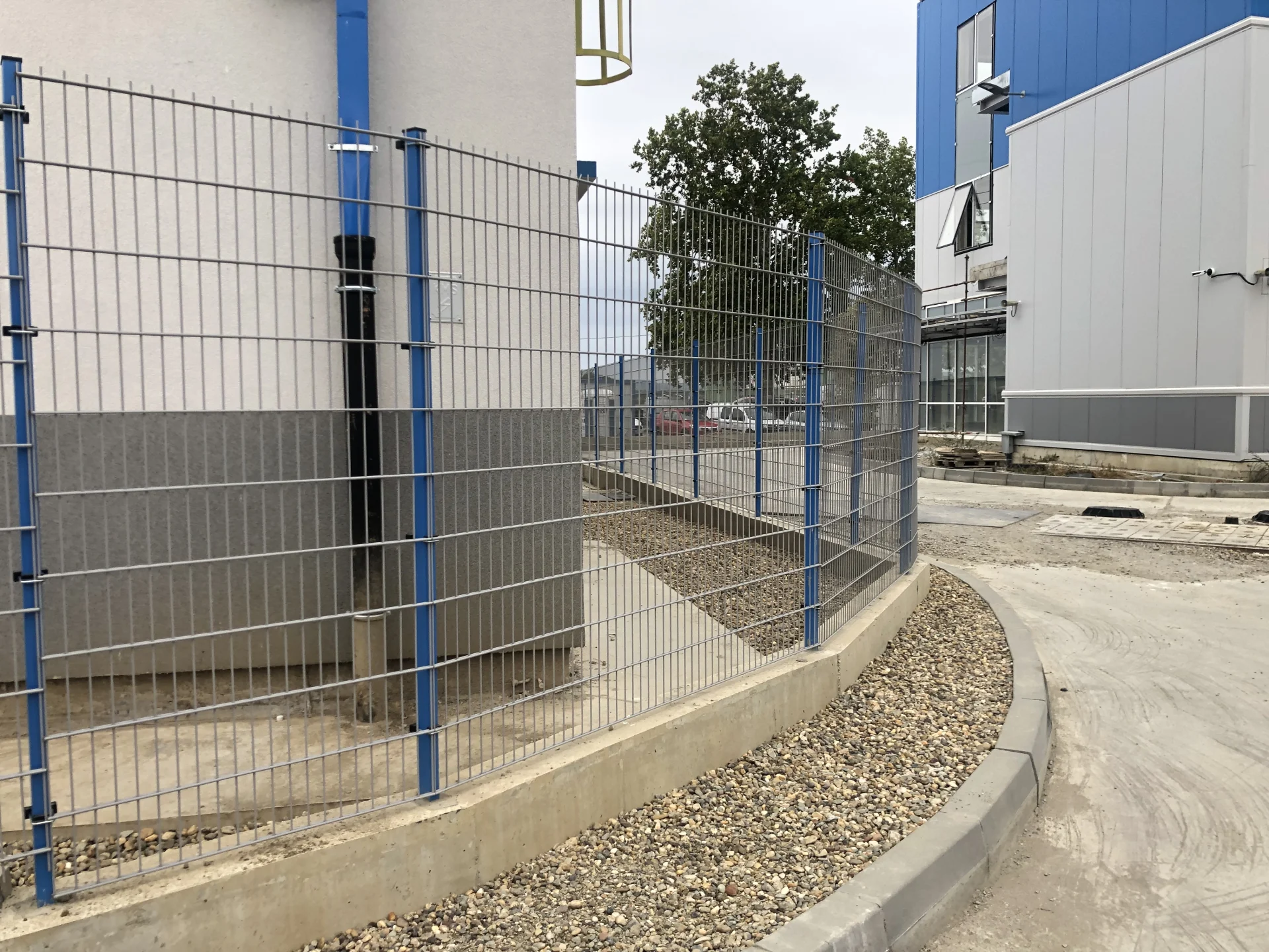 Boja i dizajn: Ograda je plastificirana u nijansi RAL7035 (svetlosiva), dok su stubovi plastificirani u boji RAL5010 (plava), čime je postignut estetski kontrast i upečatljiv vizuelni efekat.
