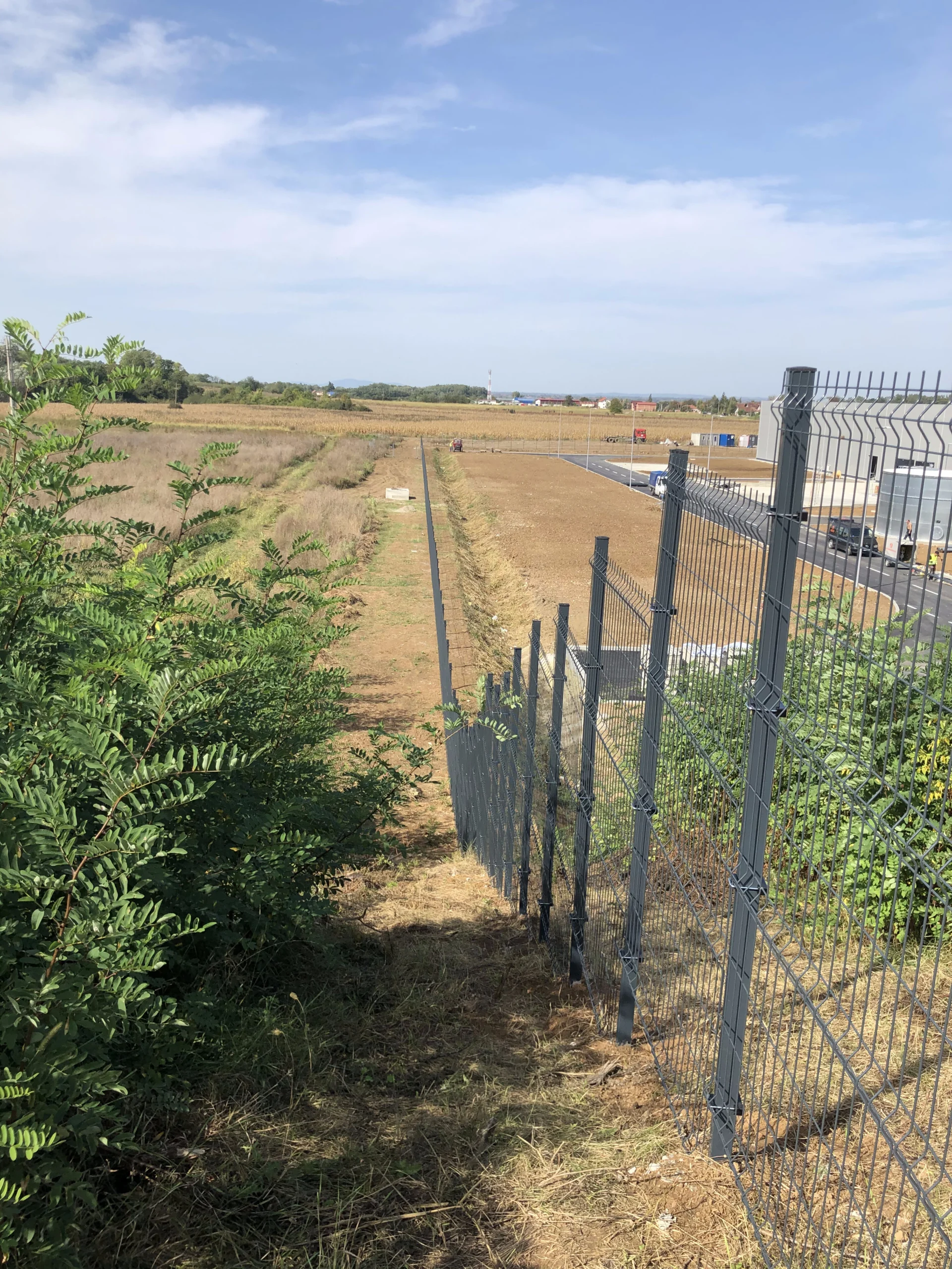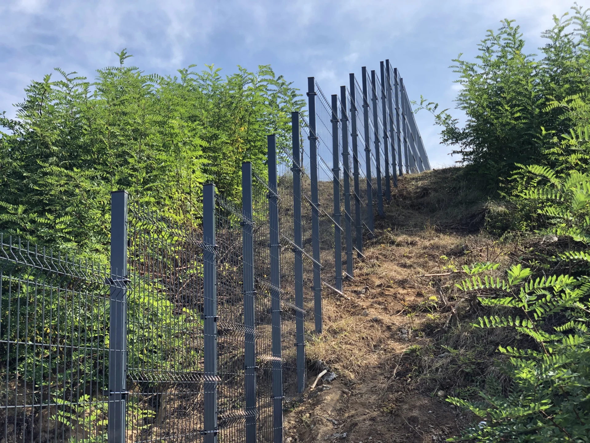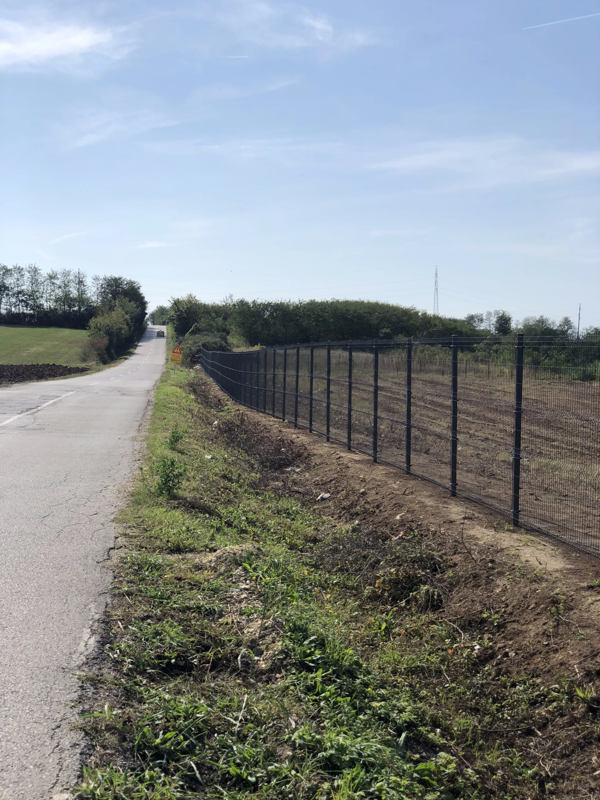 Postavljena je EUROFENCE 3D panelna ograda u boji RAL 7016 – antracit siva, koja se odlikuje visokom čvrstoćom, dugim vekom trajanja i modernim industrijskim izgledom. Ograda je montirana na usadne stubove, dok su paneli pričvršćeni pomoću INOX spojnica, čime je obezbeđena maksimalna stabilnost konstrukcije i otpornost na spoljne uticaje.