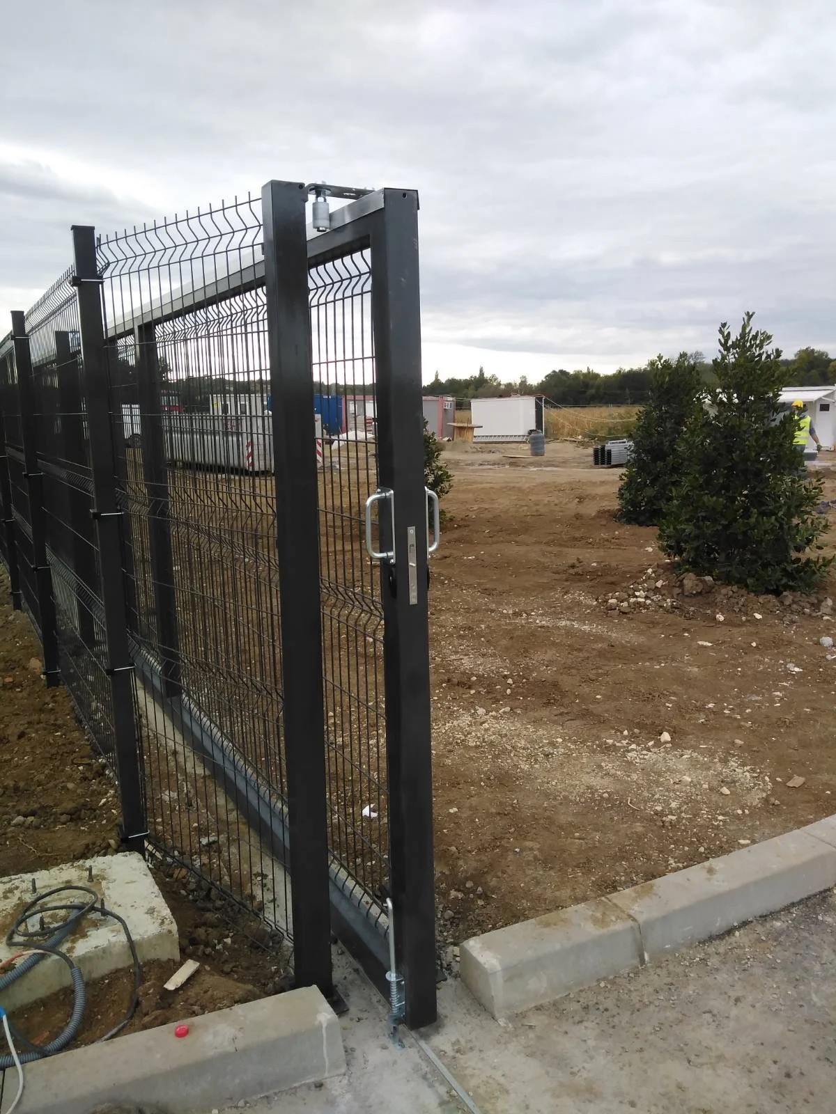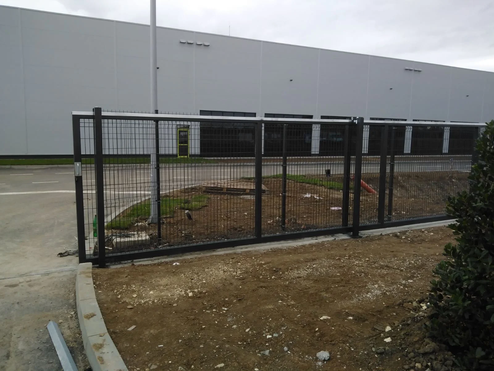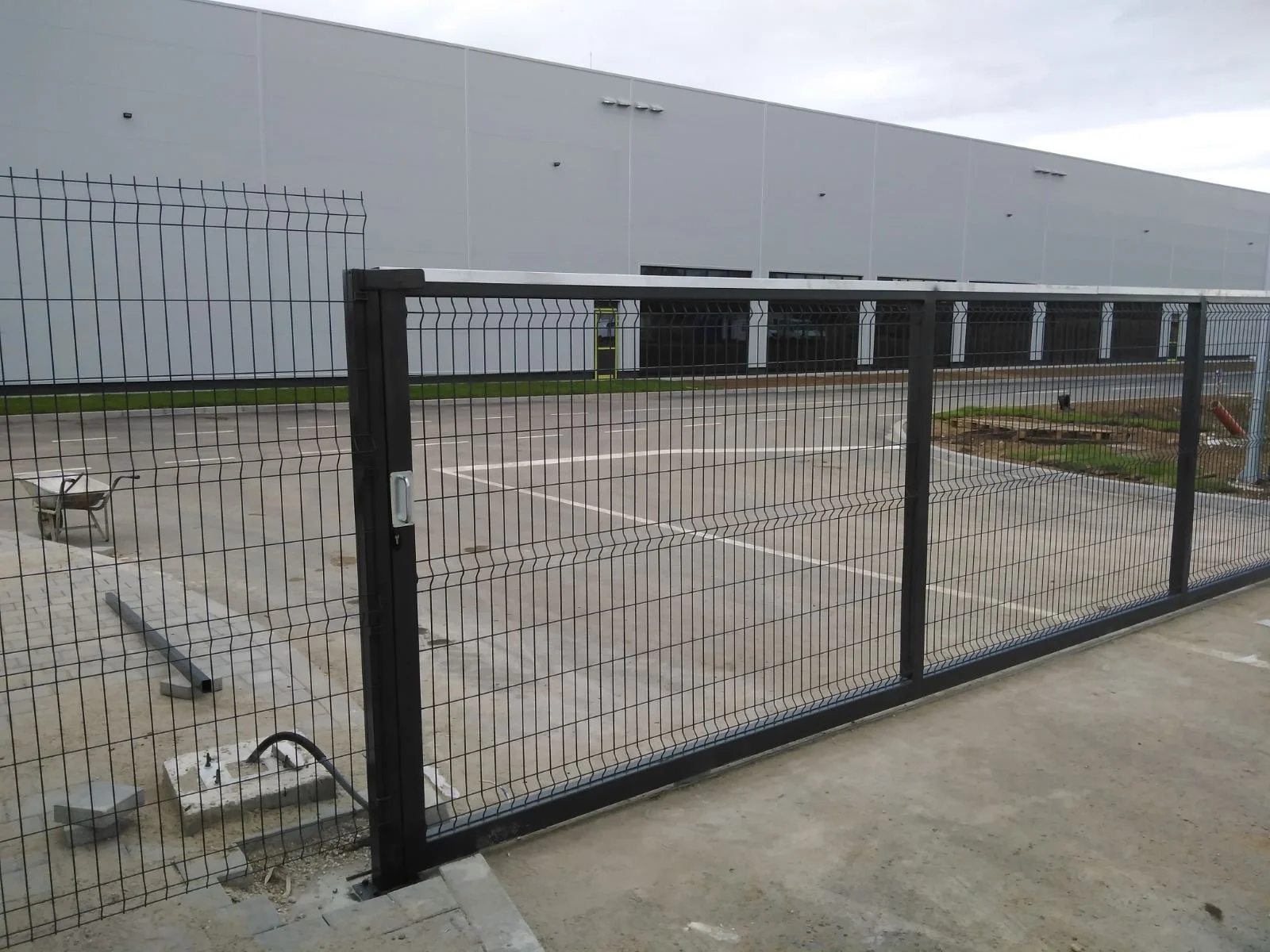 Uz panelnu ogradu ugrađena je klizna kapija LIGHT, izrađena od čeličnih toplocinkovanih profila, dodatno plastificirana u boji RAL 7016, kako bi se u potpunosti estetski i funkcionalno uklopila sa EUROFENCE 3D ogradom i arhitekturom objekta. Kapija je projektovana za pouzdan rad u uslovima čestog prolaska teretnih vozila.