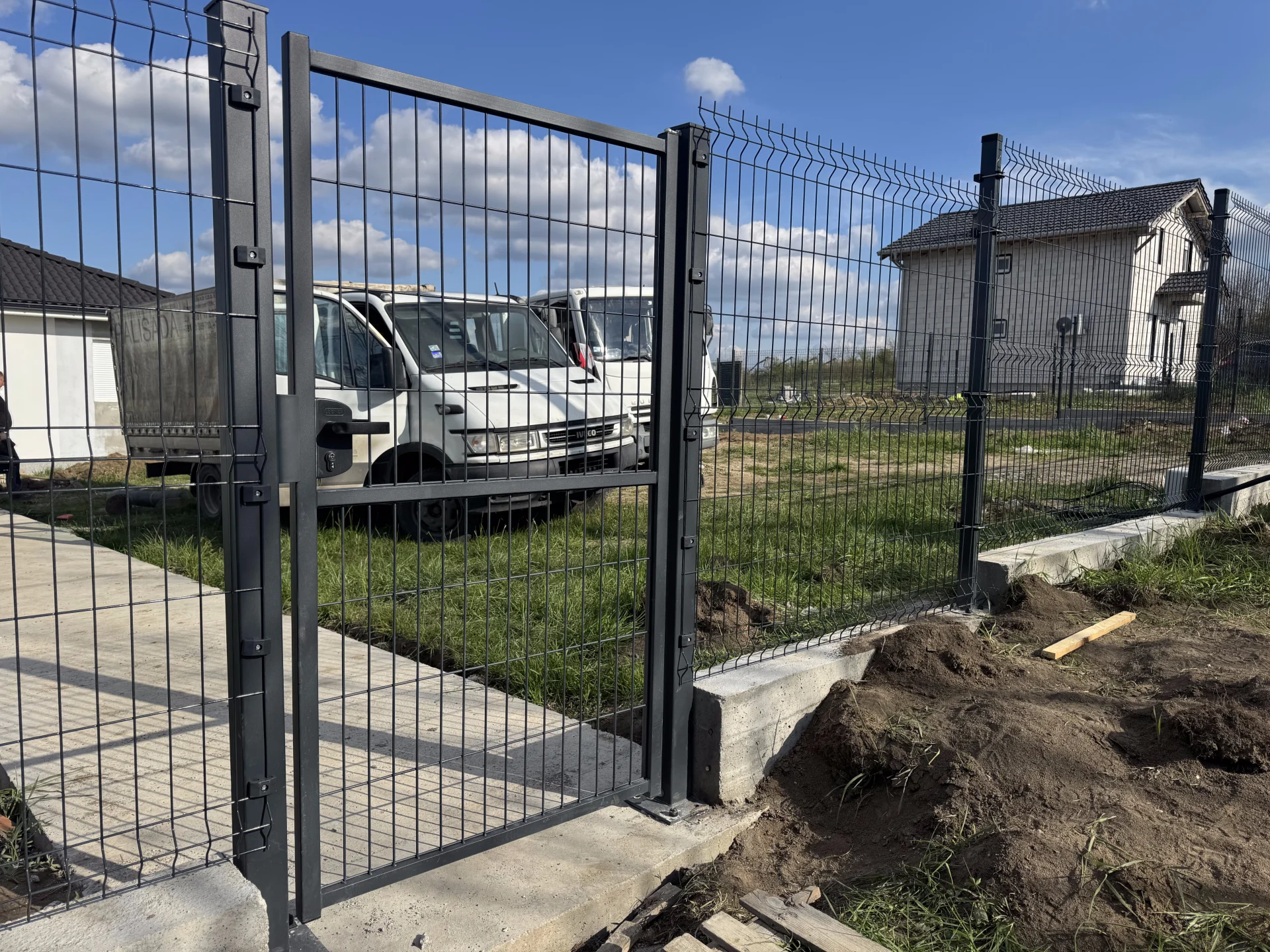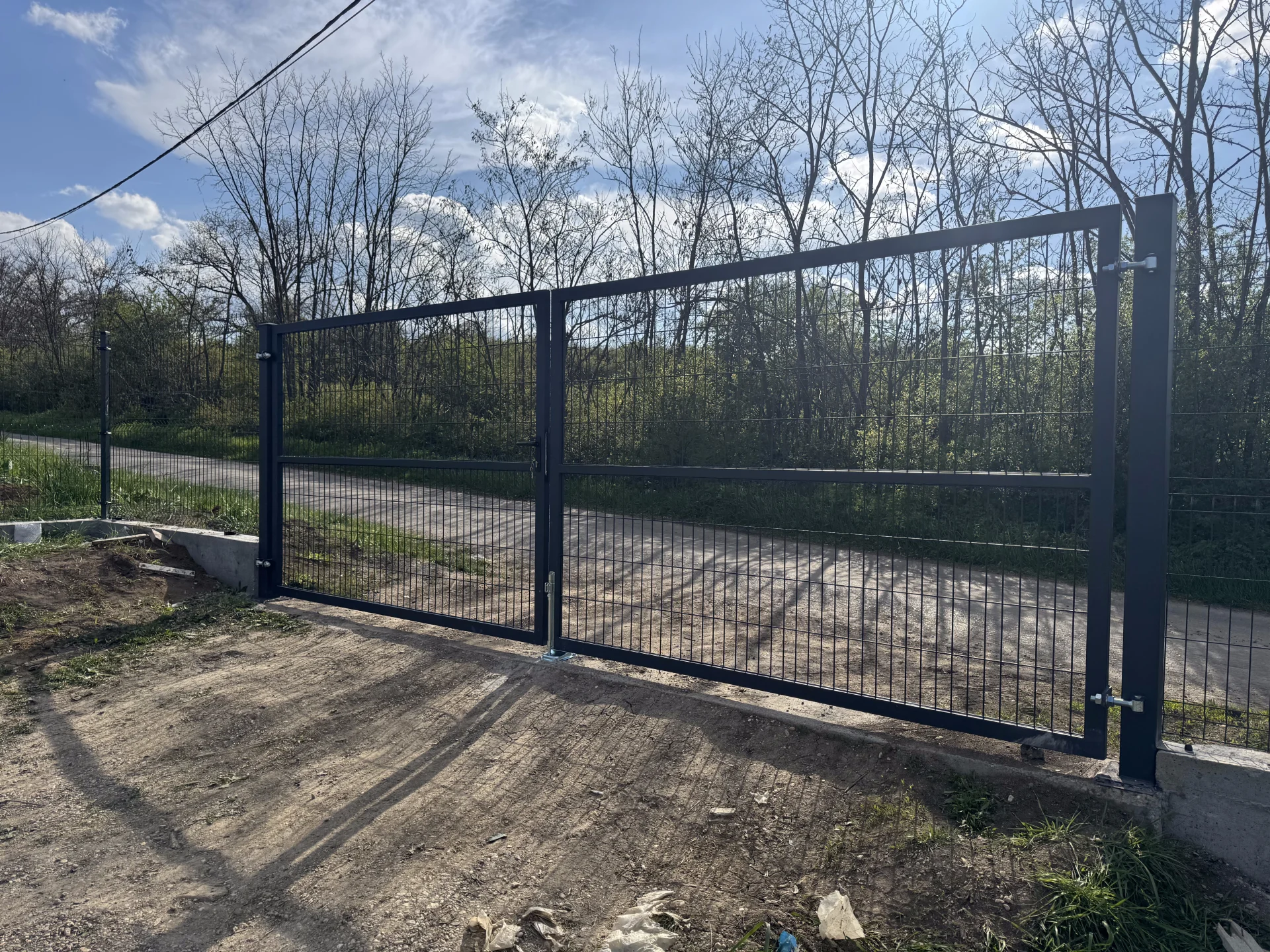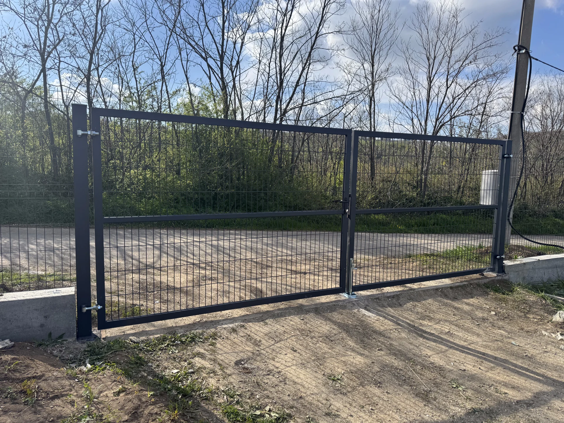 Dvokrilna kapija LIGHT: izrađena od toplocinkovanih čeličnih profila, sa ispunom od 3D panela i završnom plastifikacijom u RAL7016. Predstavlja funkcionalno i vizuelno usklađeno rešenje za ulaz vozila.